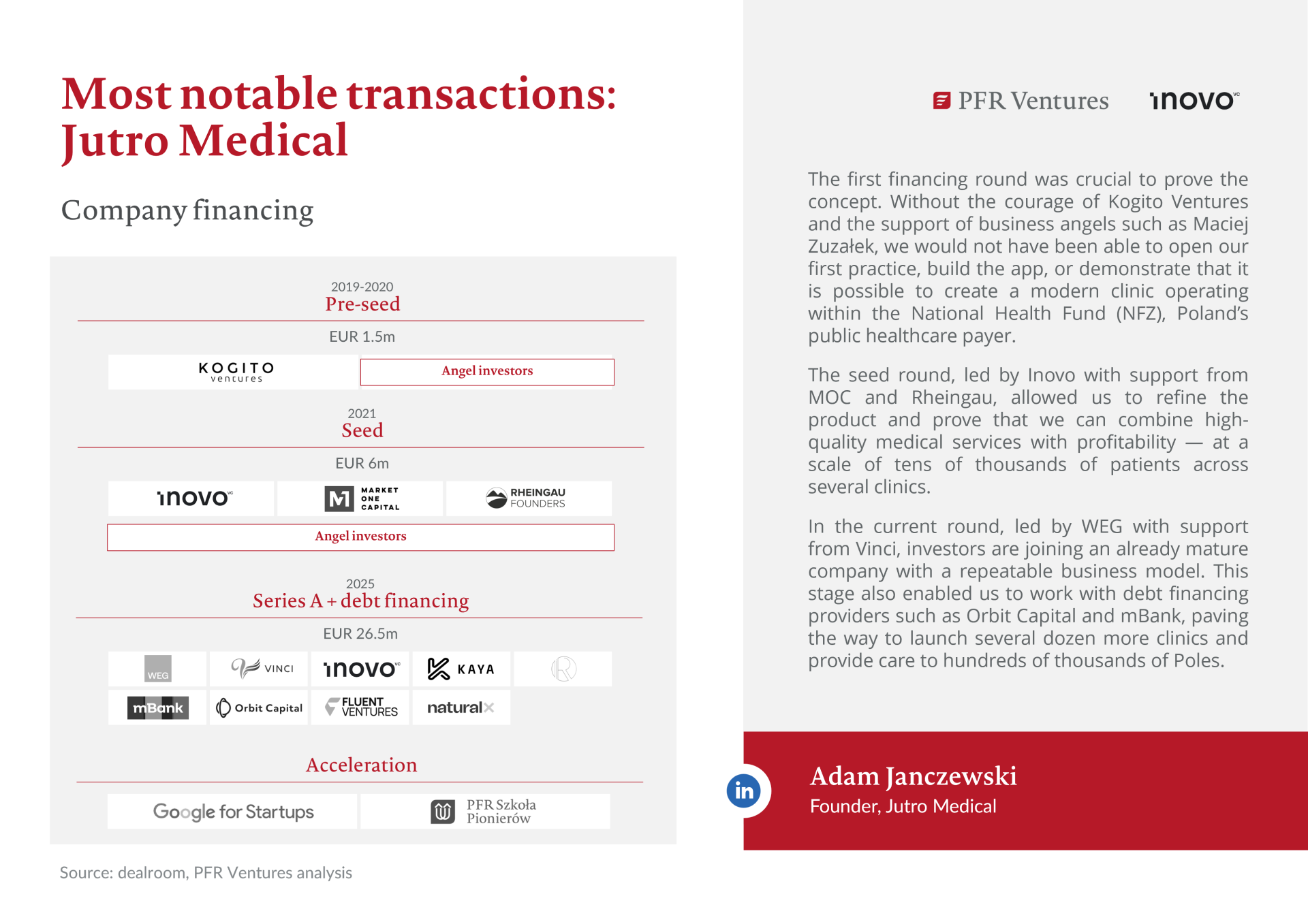 One of the largest transactions also involved Jutro Medical, whose earlier financing was provided, among others, by Kogito Ventures, Inovo VC, and Market One Capital.