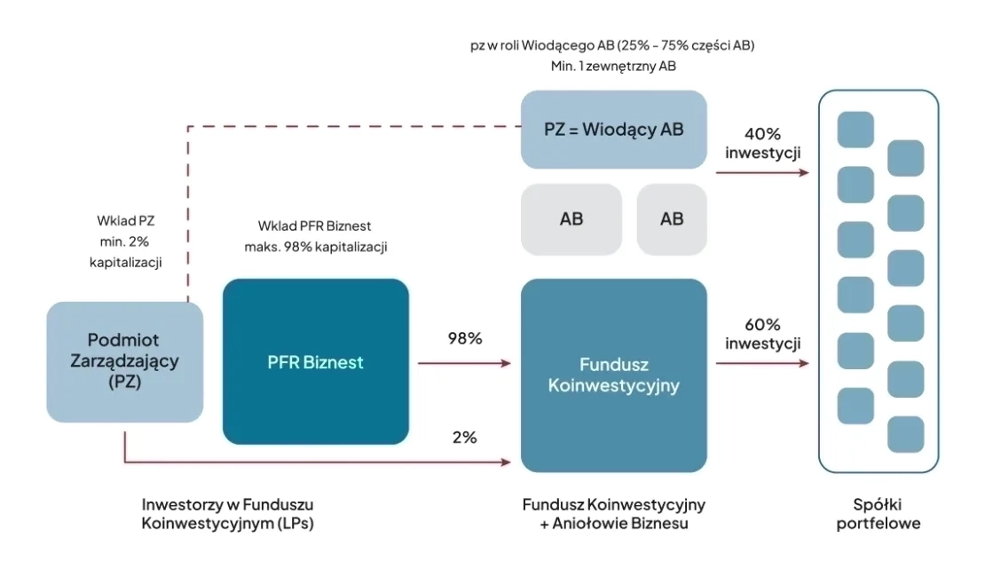 Aniołowie Biznesu mogą koinwestować poprzez wehikuły inwestycyjne będące własnością jednej lub więcej osób fizycznych. Przedstawiona w pytaniu konstrukcja w której środki Podmiotu Zarządzającego i Aniołów Biznesu są zgromadzone w jednym wehikule inwestycyjnym jest potencjalnie dopuszczalna, natomiast w określonych przypadkach może rodzić wątpliwości dotyczące niezależności Podmiotu Zarządzającego od Aniołów Biznesu i potencjalnego konfliktu interesów. Natomiast nie jest możliwe inwestowanie w startupy przez wehikuł inwestycyjny będący własnością Funduszu VC i Aniołów Biznesu, zainwestowane w takiej strukturze środki byłyby niekwalifikowalne z punktu widzenia przepisów unijnych i podlegałyby obowiązkowi zwrotu.
